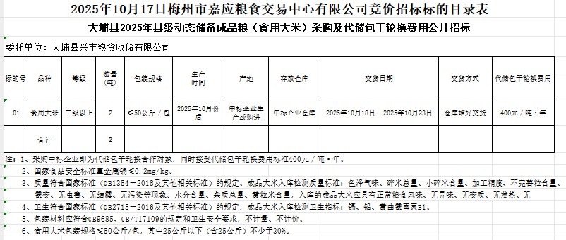 大埔縣2025年縣級動態(tài)儲備成品糧(食用大米)采購及代儲包干輪換費(fèi)用公開招標(biāo)公告