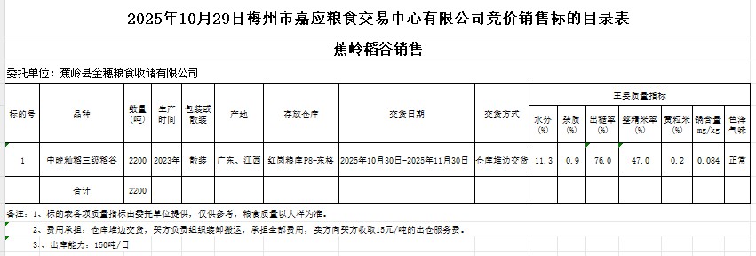 受客戶(hù)委托,梅州市嘉應(yīng)糧食交易中心有限公司定于2025年10月29日(星期三)舉辦糧食競(jìng)價(jià)交易會(huì)。蕉嶺縣金穗糧食收儲(chǔ)有限公司擬銷(xiāo)售2023年產(chǎn)中晚秈稻谷2200噸。